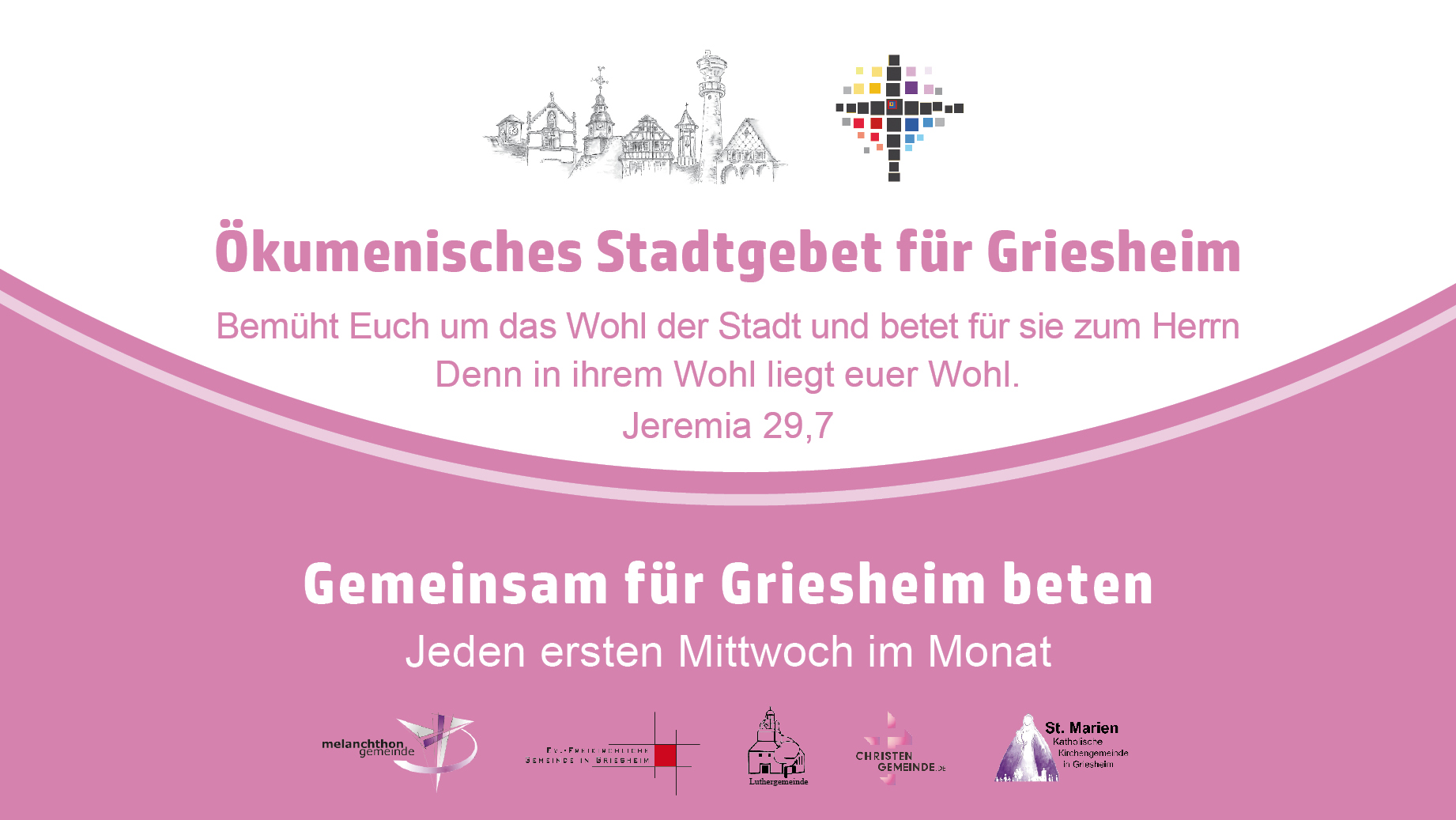 Jeden ersten Mittwoch im Monat treffen sich für eine knappe Stunde Christen, um für ihre Stadt Griesheim zu beten. Im Wechsel laden die einzelnen Gemeinden in ihre Kirche oder Gemeinderäume ein und gestalten die Treffen in bunter Vielfalt.